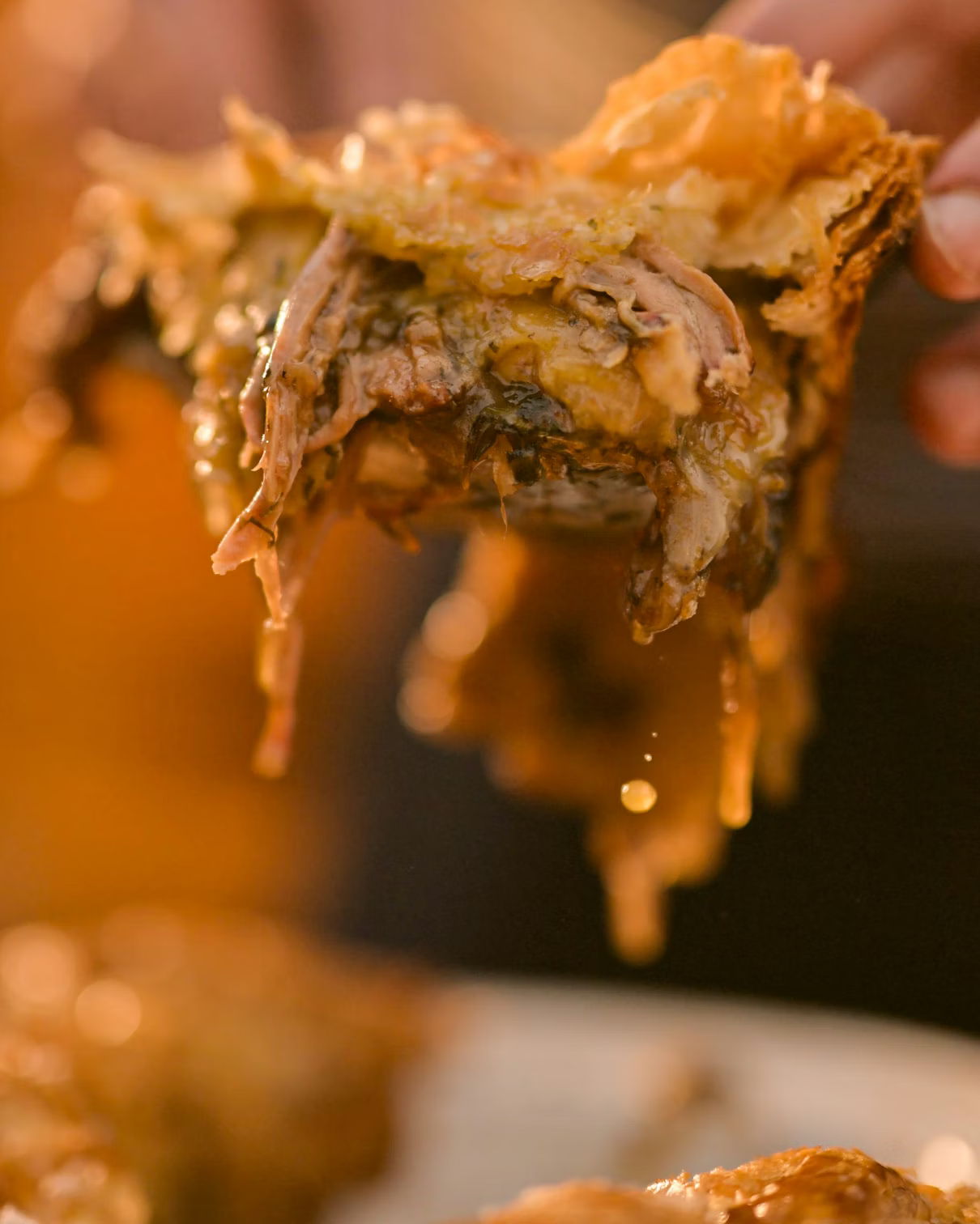 Remove the lamb shoulder and set it aside to cool, leaving the vegetables and juices behind in the pan. Once cool, pick the meat from the bones. Don’t be afraid of the crispy bits – they’ll add lots of flavour.