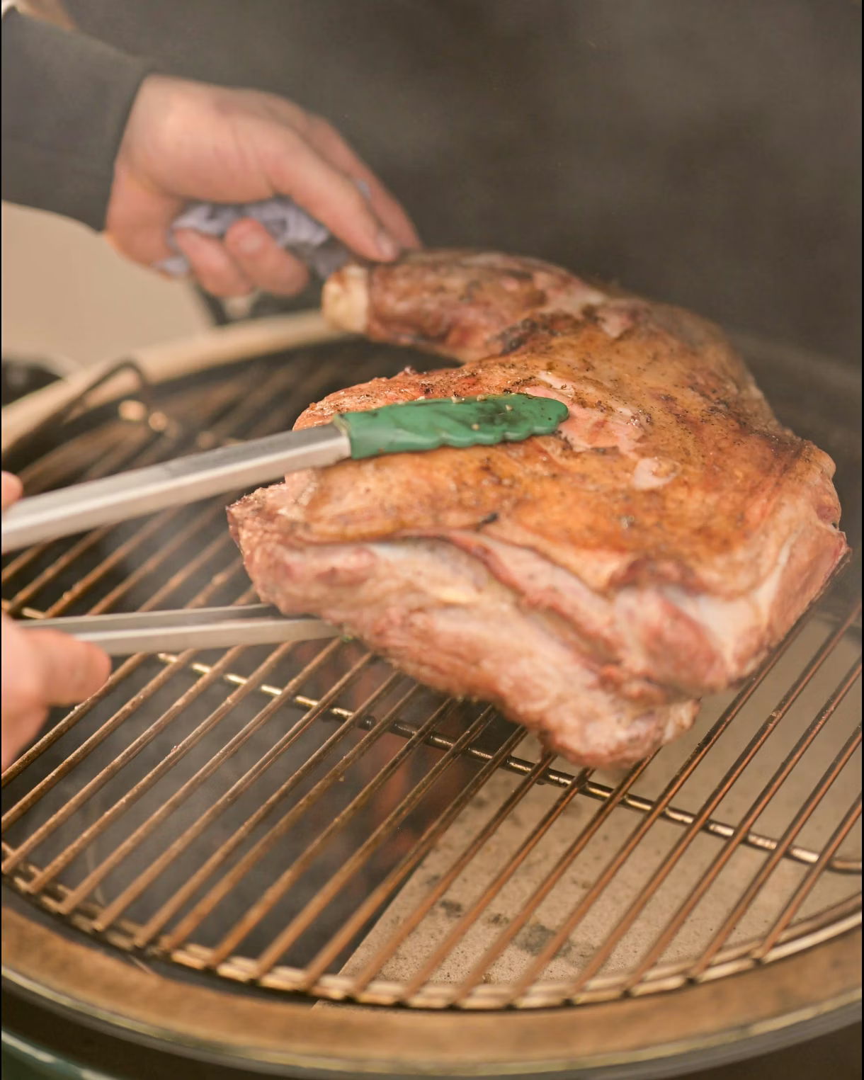 Switch your EGG to an indirect setup by installing the ConvEGGtor in a legs-up position, topped with the grid. Bring the temperature down to 160°C. You can leave the lamb on the grid to roast while the temperature comes down.