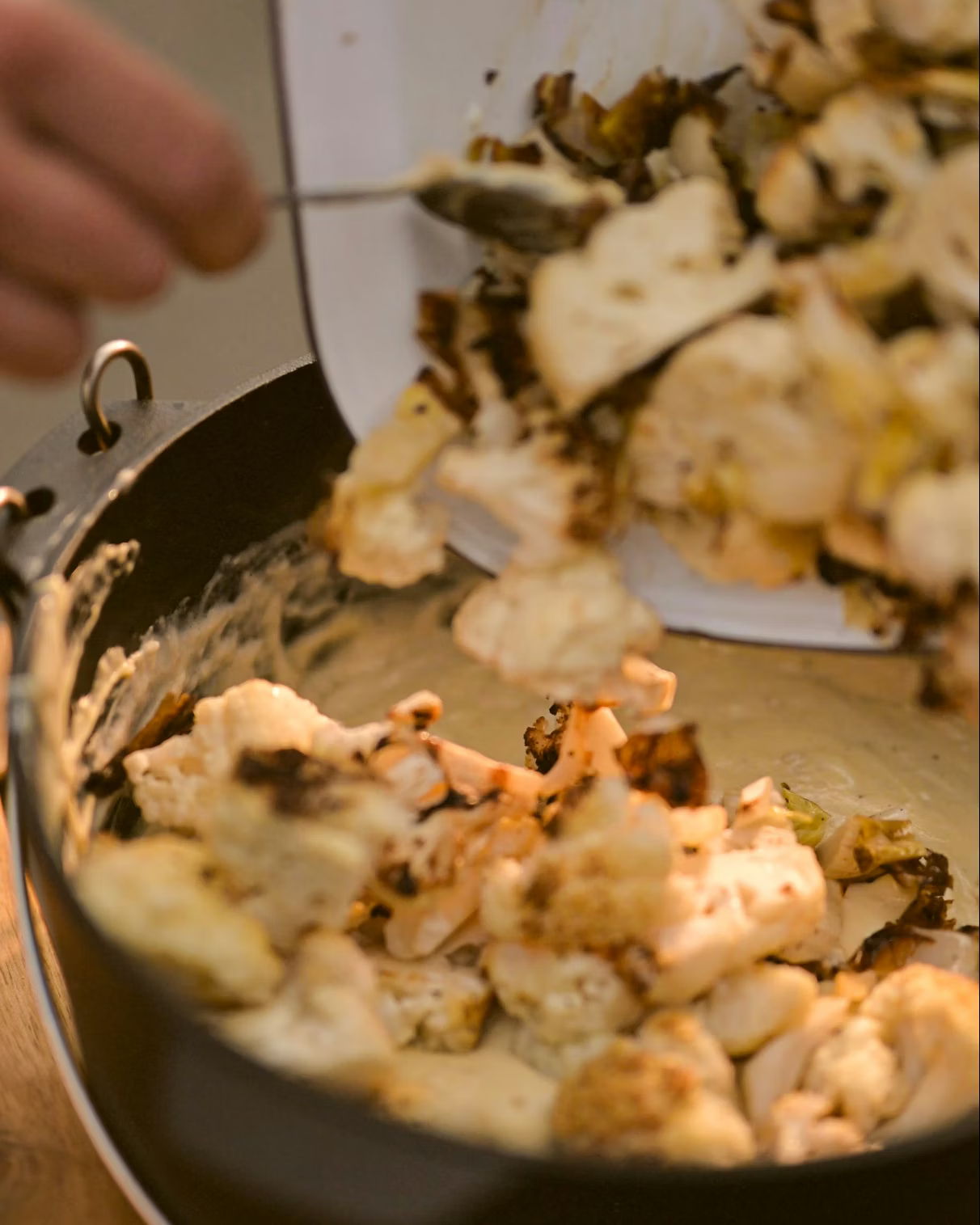 Warm a splash of rapeseed oil in a pan, then soften the leeks with 2 cloves of chopped garlic. Add the cauliflower florets, then pour over the cheese sauce.