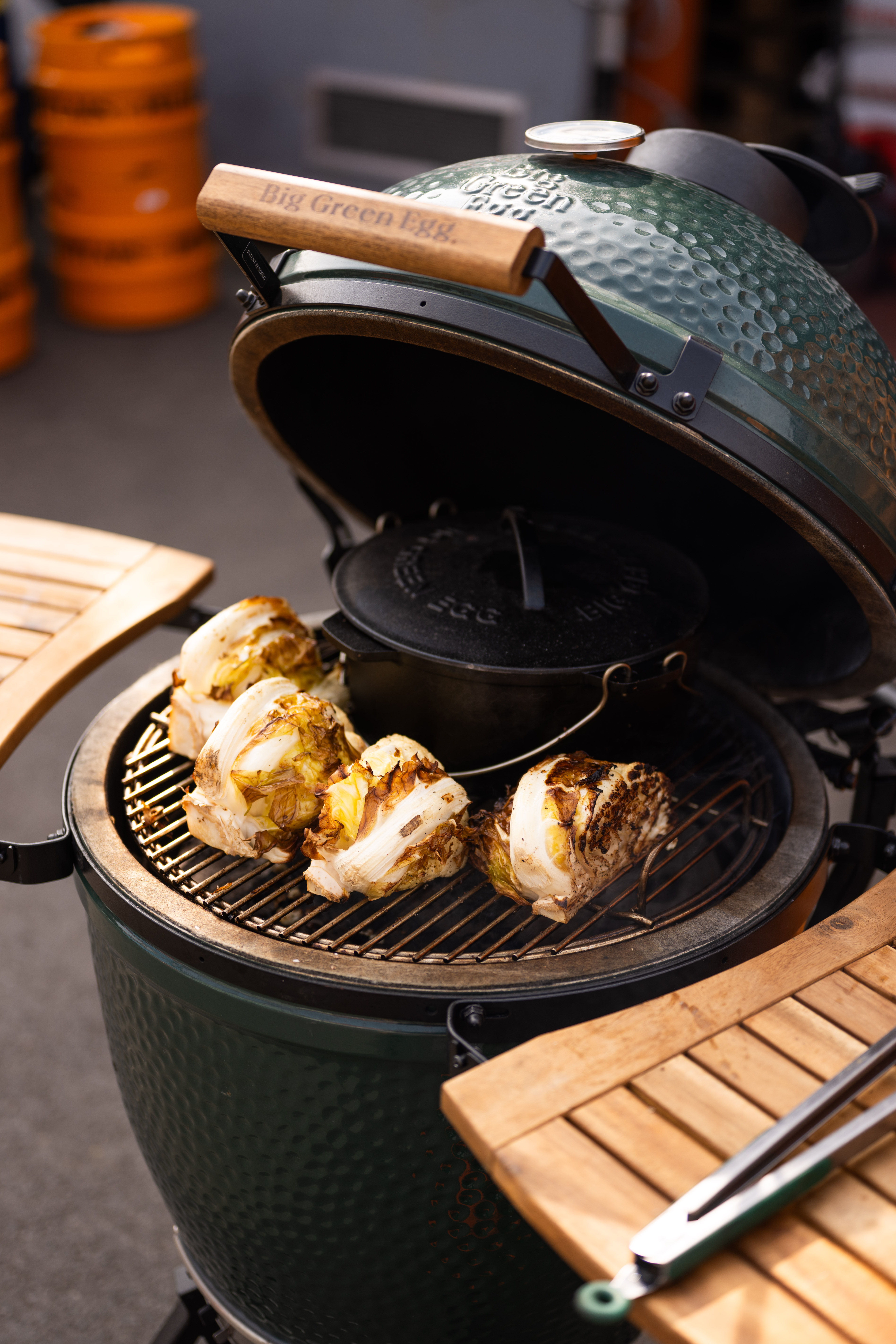 Set up your EGG for indirect cooking, with the ConvEGGtor in a legs-up position, topped by a Stainless Steel Grid. The target temperature is 180°C.